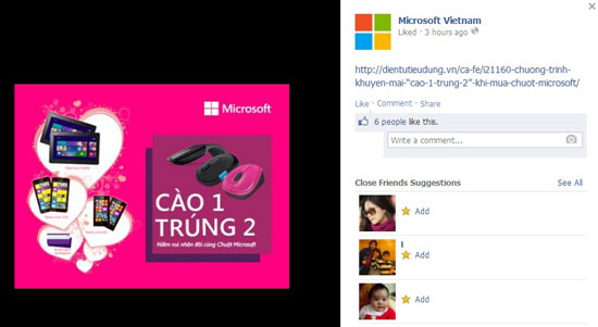 Từ nay đến 20/4, khách hàng mua các dòng sản phẩm chuột Arc Touch Mouse, Sculpt Comfort Mouse, Wireless Mobile Mouse 1000, Wireless Mobile Mouse 3500 và Wireless Mobile Mouse 4000. Các cơ hội trúng thưởng của chương trình này đều được nhân 2: cặp điện thoại Nokia Lumia 1320, cặp Lumia 525 hoặc cặp vé xem phim rạp MegaStar.