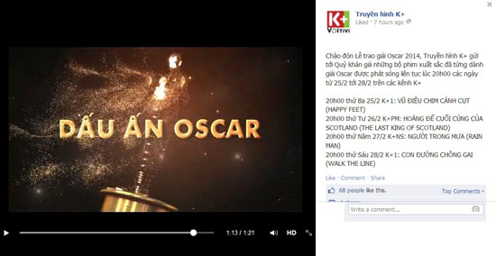 Lễ trao giải Oscar lần thứ 86 sắp diễn ra vào ngày 2/3, và danh sách các bộ phim được đề cử cũng đã được công bố. Để hướng tới sự kiện này, K+ lên kế hoạch sẽ chiếu một loạt phim từng đoạt giải Oscar ở các hạng mục khác nhau vào lúc 20 giờ các ngày từ 25 đến 28/2. Các bộ phim này gồm Vũ điệu chim cánh cụt (Happy Feet), Hoàng đế cuối cùng của Scotland (The Last King Of Scotland), Người trong mưa (Rain Man) và Con đường chông gai (Walk The Line).