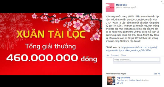 MobiFone đang triển khai chương trình khuyến mãi cho tất cả các khách hàng đăng ký gói “Tin xuân”, dịch vụ cập nhật thông tin về các hoạt động lễ hội, sự kiện văn hóa mừng xuân Giáp Ngọ 2014 trên khắp cả nước. Thông qua gói “Tin xuân”, khách hàng sẽ nhận được nhiều mã quay số trúng thưởng,. Giải thưởng tuần có thể lên đến 20 triệu đồng và giải chung cuộc là 200 triệu đồng.