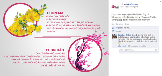 Trên Facebook của LG chia sẻ những hướng dẫn khá cần thiết về cách chọn mai, đào để chơi Tết cổ truyền. Mai thì phải chọn cây chắc gốc, cây có dáng đẹp, có số nụ và mầm lá cân bằng. Còn đào thì cây phải có dâm nhỏ và ngắn, cây nhánh chính có một điểm xuất phát trên thân. Đúng là LG cũng khéo nắm bắt thị hiếu của người Việt Nam.
