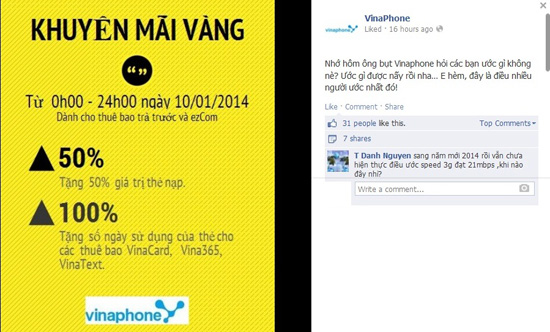VinaPhone đáp ứng nguyện ước của các khách hàng thân thiết bằng chương trình khuyến mãi vàng duy nhất trong ngày hôm nay (10/1). Giá trị thẻ nạp trả trước VinaPhone trong ngày hôm nay sẽ được tặng 50% và các thuê bao VinaCard, Vina365 và VinaText sẽ được tặng 100% số ngày sử dụng.