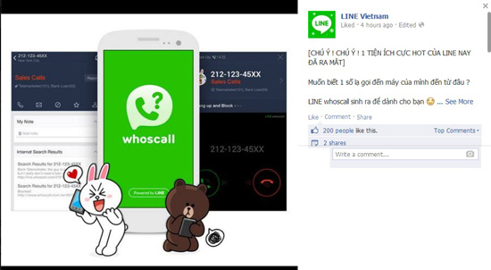 LINE vừa cho ra mắt ứng dụng được xem là rất “hot” Whoscall, giúp xác định nguồn gốc các cuộc gọi và tin nhắn từ những thuê bao không xác định. Theo giới thiệu thì hệ thống cơ sở dữ liệu toàn cầu của LINE có hơn 600 triệu số để đối chiếu, và hàng ngày có khoảng 500.000 cuộc gọi ý đồ xấu bị chặn nhờ Whoscall. Ứng dụng Whoscall đã có mặt trên hệ điều hành Android và sắp có trên iOS.