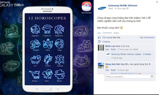Samsung đang kêu gọi các fan cài đặt ứng dụng 12 cung hoàng đạo (Horoscope) cho máy tính bảng Galaxy Tab 3 và nhiều đời máy khác nữa để cùng chuẩn bị đón năm mới Giáp Ngọ. Hiện nay có rất nhiều ứng dụng 12 cung hoàng đạo trên nền Android như Daily Horoscope hay My Horoscope…
