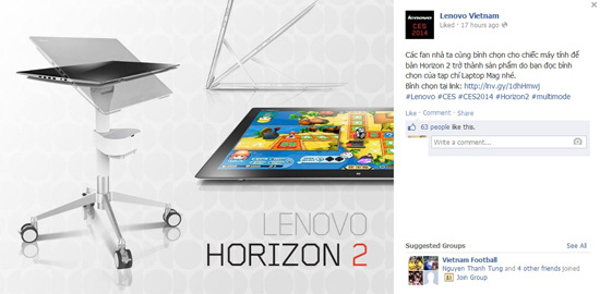 Trong một thế giới các sản phẩm công nghệ mới độc đáo tại CES 2014, Lenovo đã rất kỳ vọng vào Horizon 2, chiếc máy tính để bàn trông giống như một chiếc máy tính bảng khổng lồ. Suốt cả ngày hôm qua Lenovo còn vận động các fan bỏ phiếu cho Horizon 2 trong cuộc bầu chọn sản phẩm của CES 2014 do tạp chí LAPTOP Mag tổ chức. Tuy nhiên cuối cùng giải nhất đã thuộc về ASUS Transformer Book Duet.