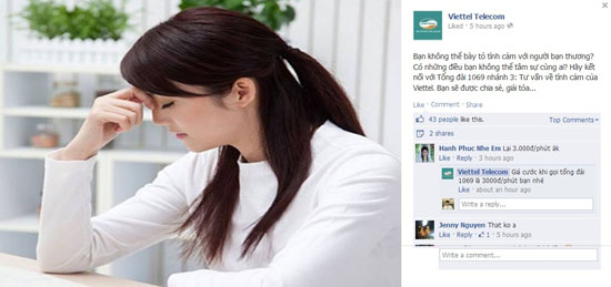 Sau đợt Valentine, Viettel đã giới thiệu ngay tổng đài 1069 nhánh 3 dành cho những bạn cần tư vấn tình cảm và cần chia sẻ, giải tỏa tâm tư. Theo Viettel, giá cước khi gọi tổng đài 1069 là 3.000 đồng/phút.