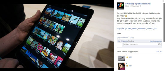 FPT Shop khẳng định, iPad Air đang là máy tính bảng có thời lượng pin tốt nhất, cho phép sử dụng Internet liên tục gần 11 giờ và gần 13 giờ xem phim. Thông số này cho thấy ưu thế nổi trội của Apple so với những đối thủ khác.