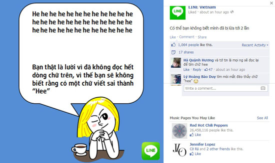 LINE cũng hưởng ứng theo phong trào chế ảnh lừa phỉnh người xem trên mạng với bức ảnh nhân vật James. Bức ảnh này khiến bạn bị lừa đọc lại một loạt chữ “He” chỉ để tìm một chữ “Hee” không tồn tại.
