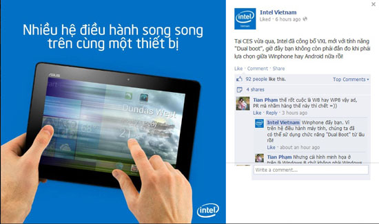 Intel dành ra một chút thời gian để giảng giải về vi xử lý mới với tính năng “Dual boot” vừa được giới thiệu tại Triển lãm CES 2014 vừa qua. Với vi xử lý mới này, người sử dụng sẽ được tùy chọn qua lại giữa Windows Phone với Android. “Trên máy tính chúng ta đã có thể sử dụng chức năng này từ lâu rồi”, Intel nói thêm.