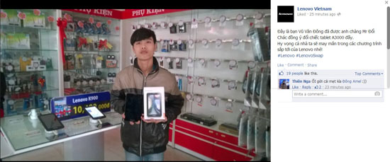 Hôm nay, Lenovo công bố hình ảnh khách hàng Vũ Văn Đông được trao tặng chiếc máy tính bảng A3000 sau trò chơi trao đổi với Mr. Đổi Chác. Như vậy, chương trình này đã chính thức khép lại để Lenovo chuẩn bị cho các game tiếp theo.