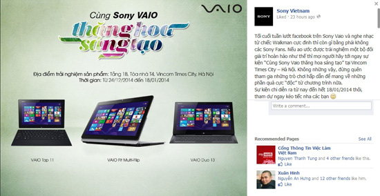 Ngay từ bây giờ, Sony đã đặt lịch vào ngày 18/1 là tổ chức sự kiện “Cùng Sony VAIO thăng hoa sáng tạo”, diễn ra tại Vincom Times City (Hà Nội). Trong sự kiện này Sony sẽ giới thiệu các sản phẩm như VAIO Tap 11, VAIO Fit Multi-Flip hay VAIO Duo 13.