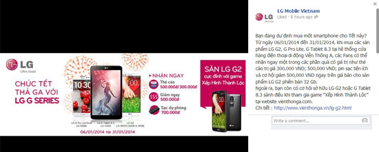 Trong dịp đón Tết Giáp Ngọ này, những khách hàng mua dòng máy G của LG sẽ được Viễn Thông A ưu đãi bằng những phần quà có giá trị như thẻ cào trị giá 300.000 đồng, 500.000 đồng, pin sạc tiện ích và đặc biệt cơ hội giảm 500.000 ngay trên giá bán cho sản phẩm LG G2 phiên bản 32 GB.