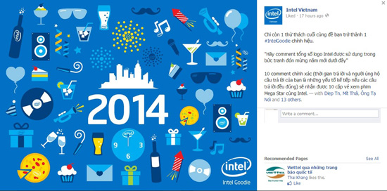 Intel thử tài mắt tinh của các fan với thử thách đếm số logo Intel xuất hiện trong hình ảnh chào đón năm 2014. 10 bình luận chính xác nhất sẽ nhận được 10 cặp vé xem phim Mega Star. Nhiều người đếm được 14 logo (tương ứng với năm 2014) nhưng cũng có người đếm được tới 15.