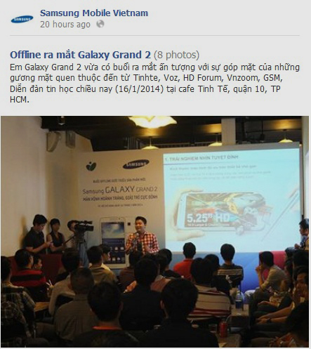 Samsung đăng loạt ảnh buổi offline ra mắt mẫu điện thoại tầm trung Galaxy Grand 2 với báo chí tại café Tinh Tế (TP.HCM). Grand 2 đã có mặt tại Việt Nam từ đầu tháng 1.