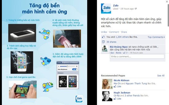 Zalo chia sẻ một số cách thông thường để tăng độ bền màn hình cảm ứng, giúp smartphone xử lý các thao tác chạm nhanh và chính xác hơn. Những cách này gồm có trang bị miếng bảo vệ màn hình, tránh ánh nắng trực tiếp và độ ẩm cao, hạn chế chơi game quá lâu, vệ sinh màn hình thường xuyên bằng vải mềm (không dùng cồn), và giảm độ sáng màn hình.