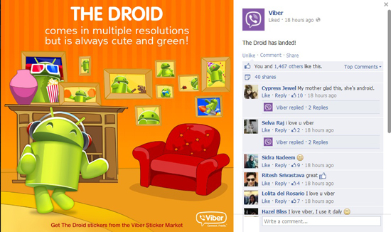 Viber đang giới thiệu bộ sticker mới với chủ thể là những chú người máy The Droid nhỏ nhắn ngộ nghĩnh, biểu tượng quen thuộc của hệ điều hành Android. Bộ sticker độc đáo này được đón nhận nhiệt tình, đặc biệt là những ai đang sử dụng máy chạy Android.
