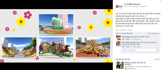 LG đang kêu gọi các fan chuẩn bị tinh thần đi chơi Đường hoa Nguyễn Huệ trong dịp Tết Giáp Ngọ 2014. Đây là một hoạt động truyền thống ở TP.HCM, thu hút rất đông khách tham quan, và chắc chắn sẽ là cơ hội để tận dụng những thế mạnh của máy ảnh LG.