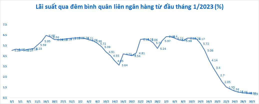 Hệ thống ngân hàng có thanh khoản tốt khi cả hệ thống từ 17/3 tới nay chỉ cần bơm 215,5 tỷ đồng. Lãi suất qua đêm trên hệ thống tụt giảm xuống mức thấp hơn thời Covid-19, khi chỉ còn 0,9% tính tới 30/3, so với đỉnh cao 8,44% ghi nhận hôm 5/10/2022, hay mức phổ biến trên 6% hồi đầu tháng 3/2023.