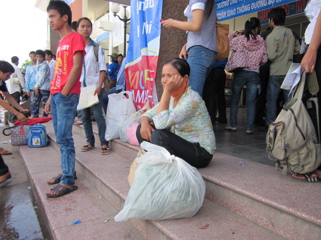 Mặt mũi tái mét, mệt phờ khi vừa xuống bến xe chị Nguyễn Thị Chăm (Hưng Yên) xua tay: “Nông dân chẳng mấy khi đi đường xe, cứ lên ô tô ngửi thấy mùi xăng là say, thấy chóng mặt, khó chịu lắm. Cũng may nhà ở ngay đây còn đi chứ không cũng khốn khổ vì tàu xe”. Dựa người vào một góc tường, hai mẹ con chị Chăm như lọt thỏm giữa hàng trăm gia đình sĩ tử giữa bến xe Giáp Báp.