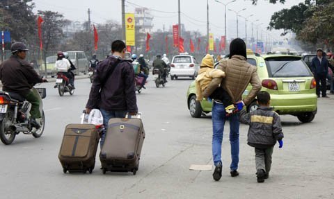 Nhiều gia đình với những vali to, nhỏ ra bến xe Giáp Bát đón xe về quê nghỉ Tết