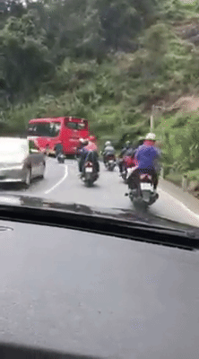 Theo đó, nhóm bạn trẻ trên có gần 10 xe máy nối đuôi nhau, đang ra sức vượt chiếc xe khách đi phía trước dù làn đường ngược chiều đang có nhiều phương tiện lưu thông, đây là đoạn đường đèo khúc khuỷu và hạn chế tầm nhìn.