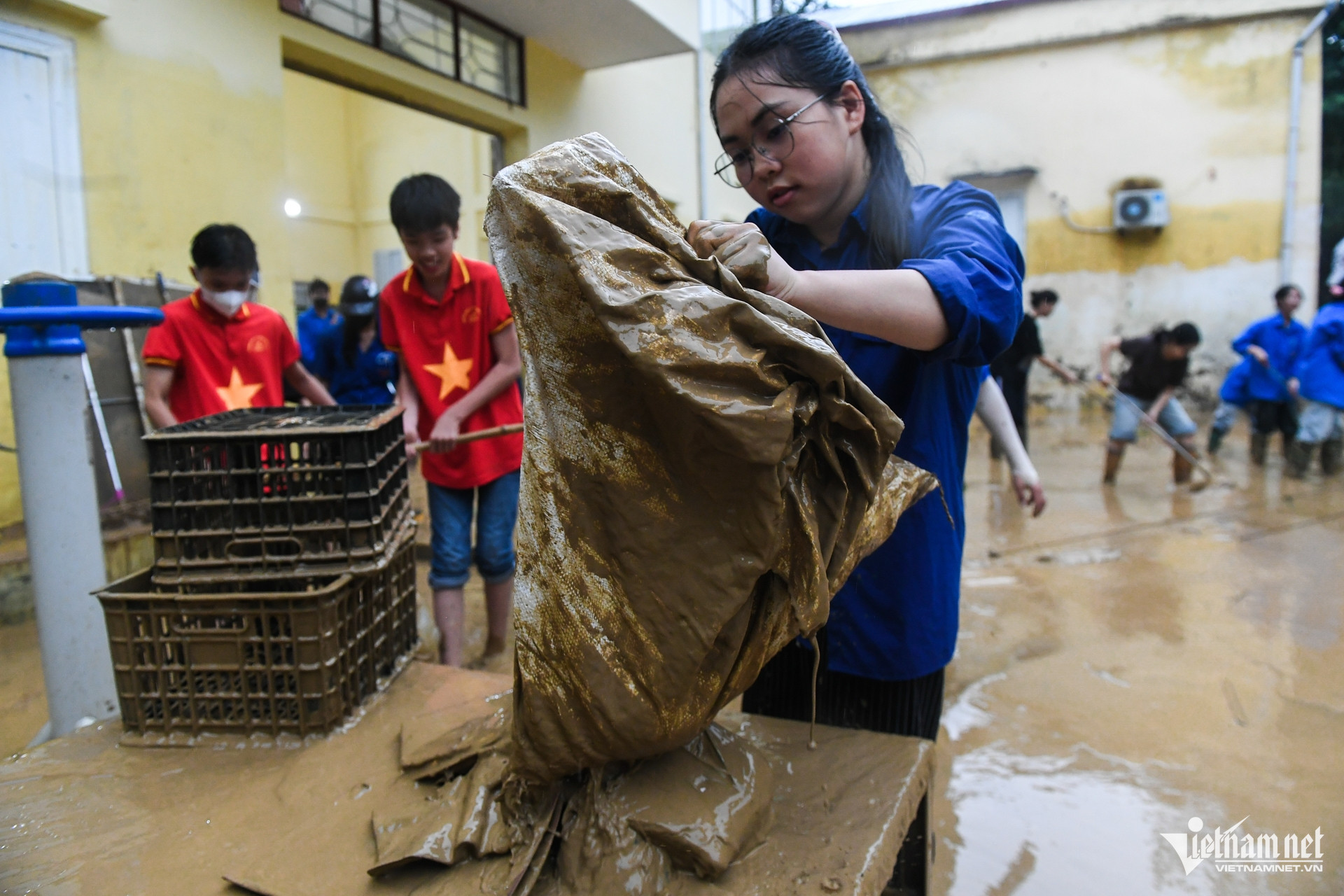 Tại trường THCS Vân Hà, lực lượng chức năng và các tình nguyện viên có mặt để hỗ trợ dọn dẹp các phòng học. Trong trận lụt, nước lũ dâng cao quá 2m, khiến toàn bộ tầng 1 dãy nhà chìm trong biển nước.