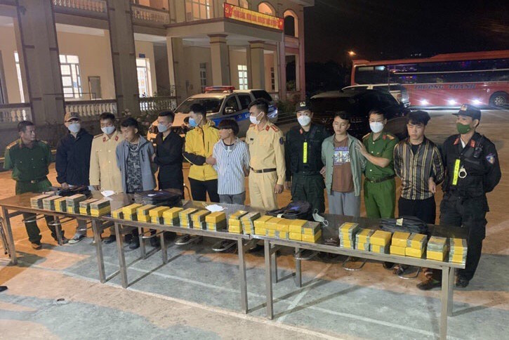 Tại hiện trường, lực lượng chức năng thu giữ 4 ba lô bên trong chứa 115 bánh chứa chất bột màu trắng (nghi là heroin), 5 điện thoại và 10,5 triệu đồng tiền mặt.