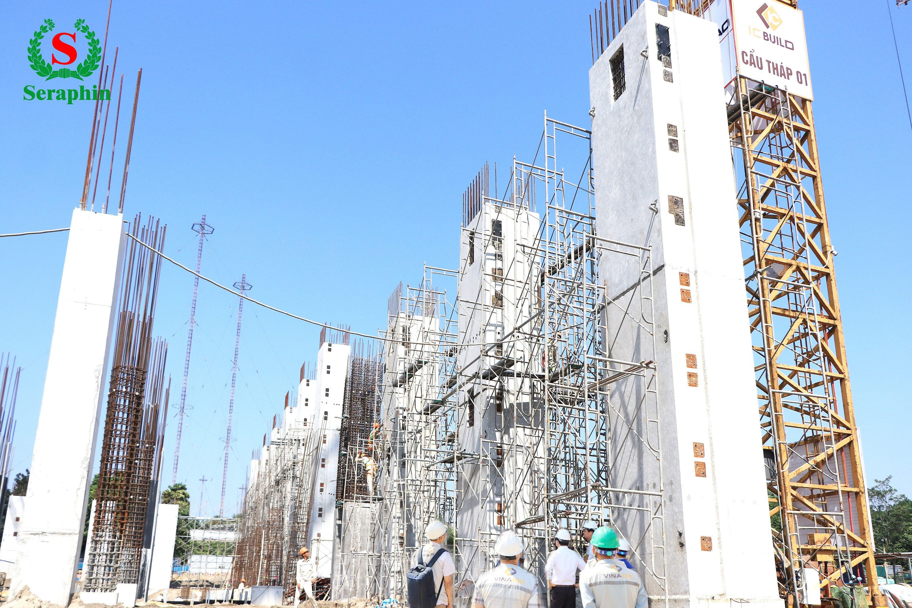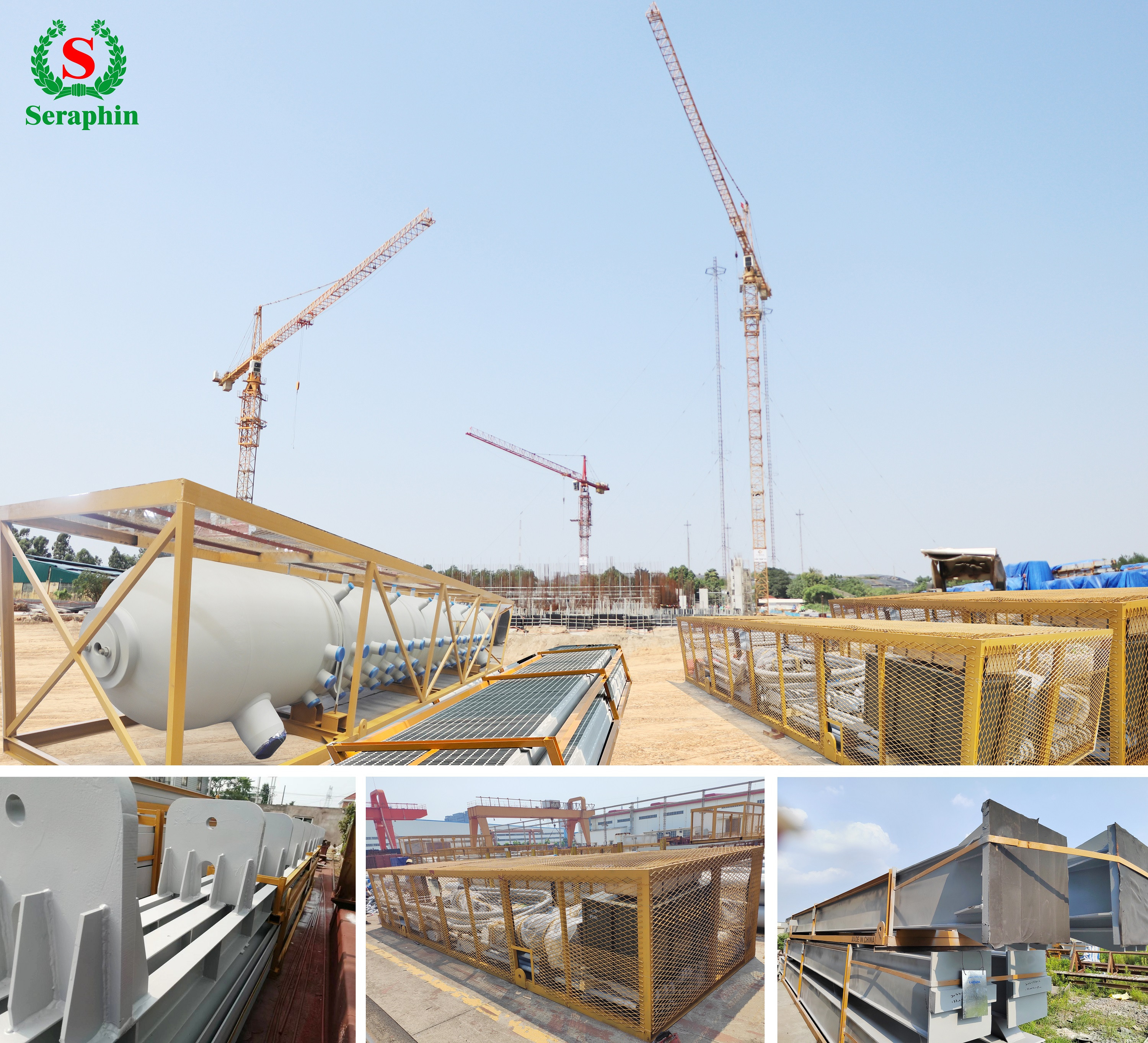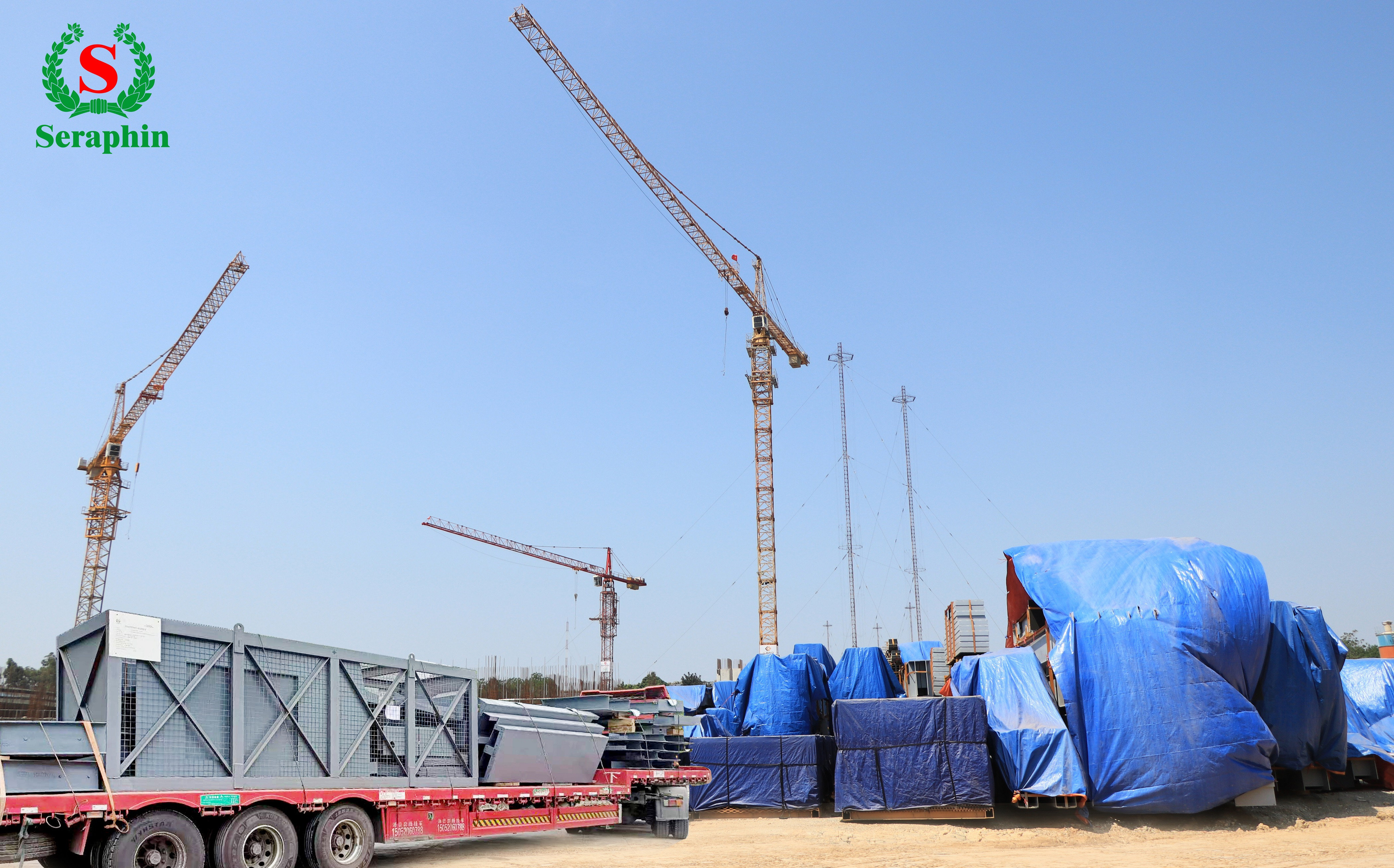 Bên cạnh khu vực đang thi công những khối đế và dầm cột đang ngày một vươn cao, bãi tập kết hơn 6.000 tấn máy móc thiết bị nhập khẩu đã về đến dự án (như bao hơi, lò đốt…) sẵn sàng thực hiện những công đoạn quan trọng tiếp theo cho nhà máy SERAPHIN. Trong khi máy móc công nghệ quan trọng được đặt hàng trước khi khởi công đã tập kết sẵn tại chân công trình. Hiện máy móc thiết bị vẫn tiếp tục được sản xuất, nhập khẩu và liên tục vận chuyển về công trình để sẵn sàng cho thời gian tới sẽ tiến hành lắp đặt. Theo kế hoạch, dự kiến ngày 31/03/2023 sẽ tập kết đủ 100% thiết bị về dự án. Hàng chục giàn cẩu lắp ghép thực hiện nhiệm vụ song song vừa lắp máy, vừa lắp kết cấu nhà xưởng cho SERAPHIN.