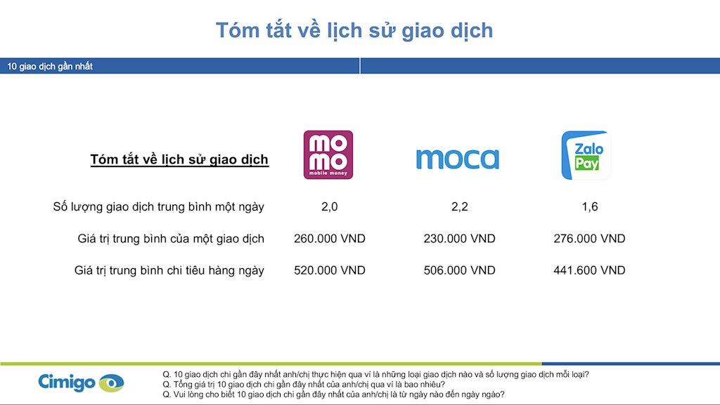 Kết quả nghiên cứu cho thấy nhu cầu sử dụng ví điện tử đang ở mức cao. Cụ thể, những người được hỏi chi tiêu trung bình 230.000 – 274.000 VND/giao dịch, với tần suất khoảng 1,6 – 2,2 giao dịch/ngày. Trung bình mỗi ngày, người dùng Moca thực hiện 2,2 giao dịch, cao hơn người dùng MoMo với 2,0 giao dịch và người dùng ZaloPay với 1,6 giao dịch.