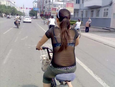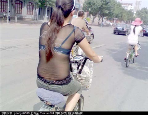 Qua những bức ảnh có thể thấy cô gái diện chiếc áo mỏng tới nỗi gần như để lộ hết nội y vẫn thong thả đạp xe trên phố. Được biết những bức ảnh này do cư dân mạng có nickname george0009 chụp trong một ngày hè oi bức. George0009 cho rằng những ngày nóng nực sẽ làm tăng cơ hội phạm tội của những kẻ có ý đồ xấu khi mà ngày càng có nhiều cô gái ăn mặc quá "mát mẻ" như vậy ra đường.
