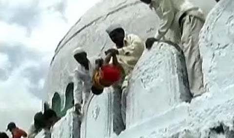 Đoạn video về một buổi lễ vào năm 2009 cho thấy những tu sĩ mặc áo choàng lắc lư những đứa trẻ trước khi ném chúng xuống bên dưới, nơi khoảng 14-15 người đang căng một tấm vải để hứng.