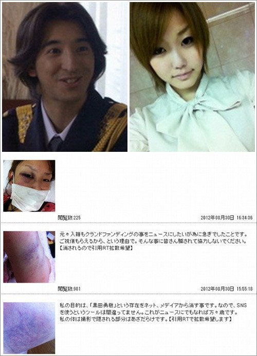 Gần đây nhất (ngày 30/8), nữ ca sỹ người Nhật đã post lên twitter những hình ảnh đầy đau thương sau khi bị chồng - một nam diễn viên nổi tiếng đánh đập dã man.