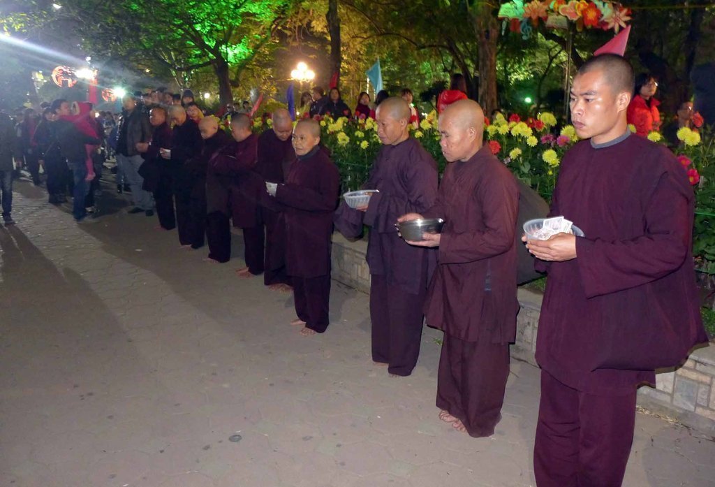 Sư giả đứng xếp hàng ăn xin đêm giao thừa ở Hồ Gươm. Ảnh: Phạm Hải