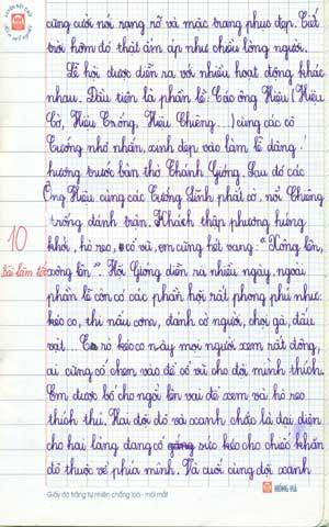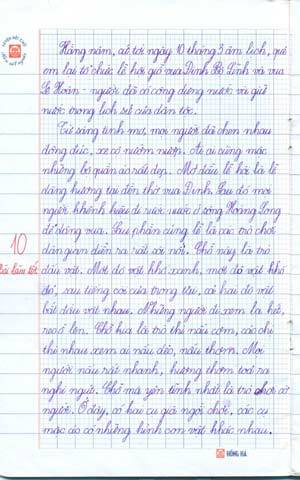 Tuy nhiên, có rất nhiều bài văn kể của học trò rất hay, như bài văn kể về ngày hội của bạn Nguyễn Thùy Linh, lớp 3B trường Tiểu học Dịch Vọng B, quận Cầu Giấy, hay các bạn Lê Phương Ly, Dương Gia Linh, Phạm Minh Hương học sinh lớp 3G trường Tiểu học Ái Mộ. Đặc biệt, hai bài văn sau của các bạn trường Tiểu học Dịch Vọng A viết thật ấn tượng: