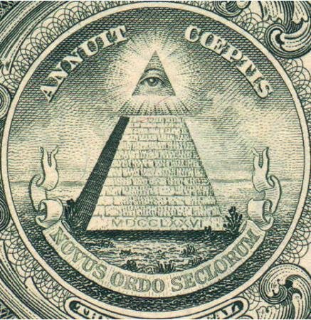 Ở phía sau tờ bạc này còn ẩn chứa nhiều bí mật ở hai vòng tròn. Cả hai vòng tròn này đều là quốc ấn của Mỹ. Ở vòng tròn bên trái là một kim tự tháp. Nếu để ý chúng ta sẽ thấy nó phát sáng trên đỉnh và cạnh phía Tây bị khuất bóng tối.