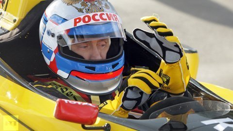 Vladimir Putin lái thử một chiếc xe đua công thức 1 tại vùng Leningrad, năm 2010.
