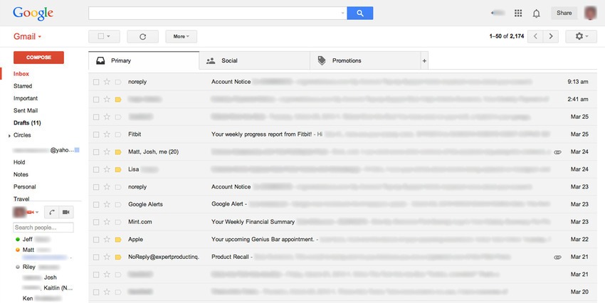 2013: cập nhật tiếp theo trong giao diện là chia email đến thành các tab riêng biệt, giảm sự rắc rối trong hộp thư đến, giúp người dùng giải tỏa áp lực từ việc liên tục nhận được thông báo từ mạng xã hội.