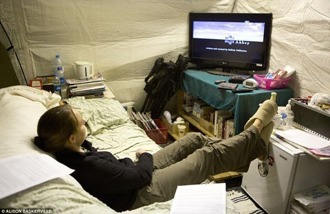 | Một nữ quân nhân đang vắt chân lên xem Downton Abbey. |