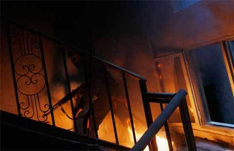 Ngày 20/4, Chris Hondros đã chụp ảnh một chiến binh nổi dậy băng mình qua cầu thang đang cháy bừng bừng để truy đuổi quân chính phủ trong một tòa nhà ở Phố Tripoli, Misrata, Libya. Cuối ngày hôm đó, Hondros và phóng viên ảnh Tim Hetherington đã thiệt mạng khi đưa tin về trận chiến giữa quân nổi dậy và lực lượng trung thành với đại tá Muammar Gaddafi. (Ảnh: Getty)