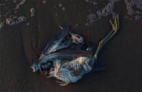 Một con diệc chết nằm trên sóng. Ngày 20/4/2010, vụ nổ ở giàn khoan dầu Deepwater Horizon, Vịnh Mexico, đã dẫn tới vụ tràn dầu tồi tệ nhất trong lịch sử nước Mỹ. Một năm đã trôi qua, hậu quả về môi sinh mà nó gây ra vẫn còn tiềm ẩn. (Ảnh: EPA)