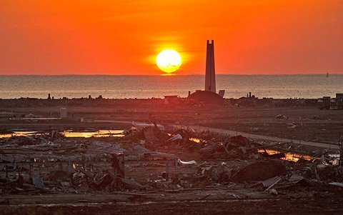 Mặt trời mọc trên biển Kesenuma, Miyagi, Nhật Bản, nơi bị tàn phá bởi trận động đất, sóng thần vào ngày 11 tháng 3 năm 2011. (Ảnh: Reuters)