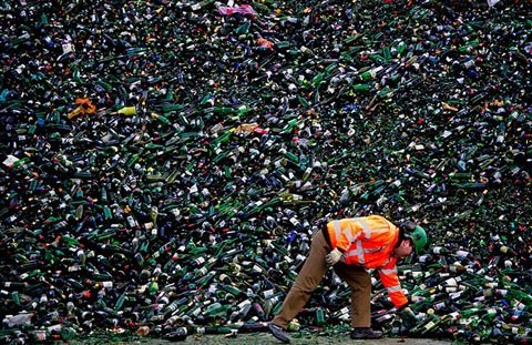 Ngày 2/1, một người lao động tại nhà máy tái chế thủy tinh ở Maltha, Heijningen, Hà Lan đang xếp gọn đống vỏ chai bia khổng lồ sau lễ Giáng sinh. (Ảnh: Getty Images)
