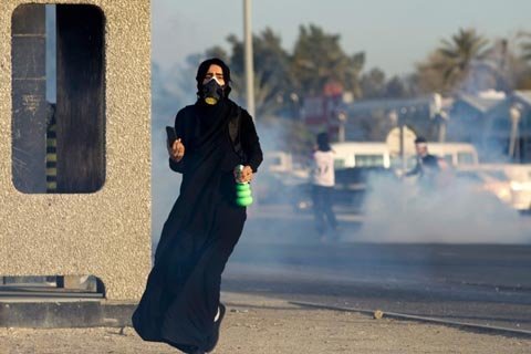 Một người phụ nữ chạy trốn khi cảnh sát bắn súng hơi cay vào người biểu tình ở Diah, ngoại ô Manama, Bahrain. (Ảnh: Reuters)