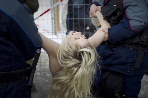 Cảnh sát Davos, Thụy Sỹ bắt giữ người biểu tình Ukraina sau khi cô gái này để ngực trần và trèo qua hàng rào để vào trung tâm hội nghị nơi đang diễn ra Diễn đàn kinh tế thế giới vào ngày 28 tháng 1. (Ảnh: AP)