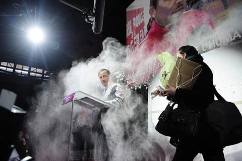 Ứng viên tổng thống Pháp bị ném bột mỳ, người bán hàng rong co ro trong bão tuyết hay người biểu tình để ngực trần xông vào trung tâm hội nghị là những hình ảnh nổi bật trong tuần qua.