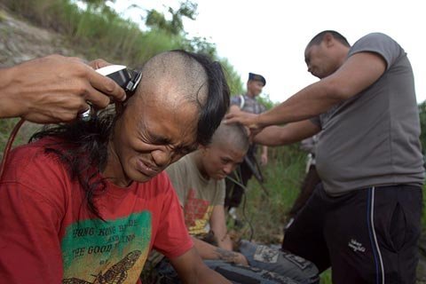 7. Những fan nhạc rock bị cảnh sát cắt tóc sau khi gây náo loạn tại một buổi biểu diễn ở Banda Aceh, Indonesia. (Ảnh: Guardian)