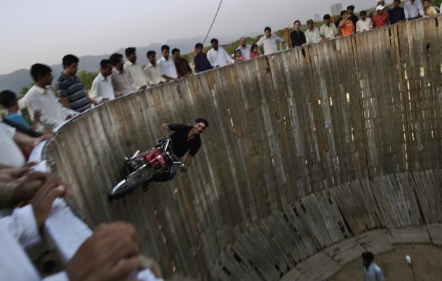 Đám đông phấn khích trước màn biểu diễn lái xe môtô trên tường của nghệ