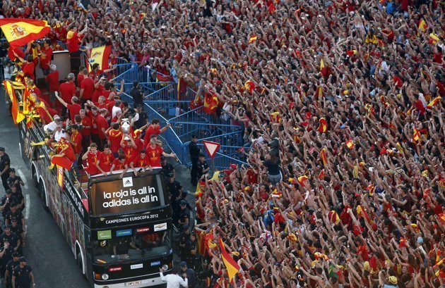 Rừng người hâm mộ chào đón đội tuyển bóng đá Tây Ban Nha. (Ảnh: Reuters)