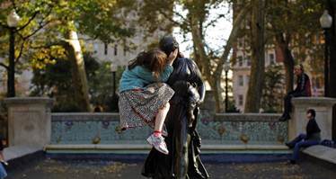 7. Một cô bé đang ngồi trên cánh tay một bức tượng ở quảng trường thành phố Philadelphia.