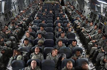 Các thành viên của Lực lượng Cảnh sát Quốc gia Virginia chờ một chiếc máy bay Mỹ buộc phải cất cánh kết thúc 12 tháng triển khai quân tại Iraq.