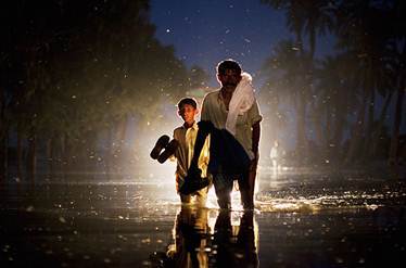 Một người đàn ông và một cậu bé di dời trước khi nước lũ tràn tới ở Punjab, Pakistan vào ngày 22 tháng 8 năm 2010.